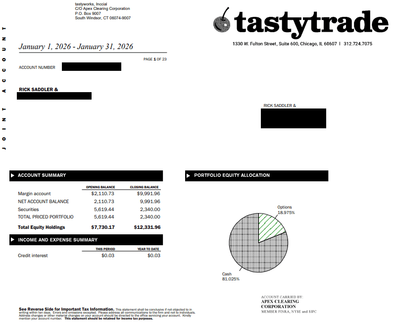 This statement is from the personal account of Rick Saddler and is being shared for educational purposes only. The account balances created by his trading results and shown on the statement are not necessarily indicative of future results. Investing and trading involve significant financial risk and is not suitable for everyone. No communication should be considered as financial or trading advice. Rick Saddler and Hit and Run Candlesticks are not responsible for your trading results.